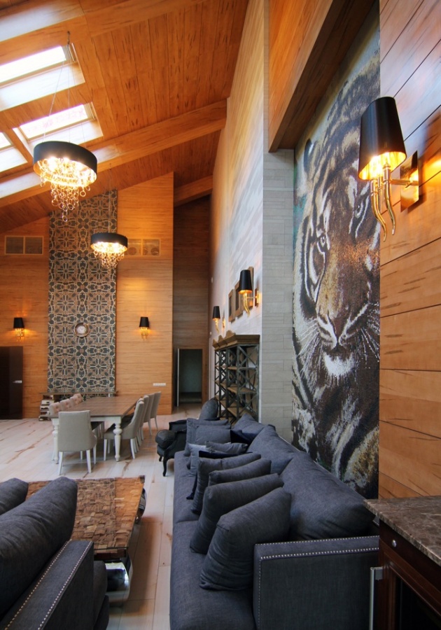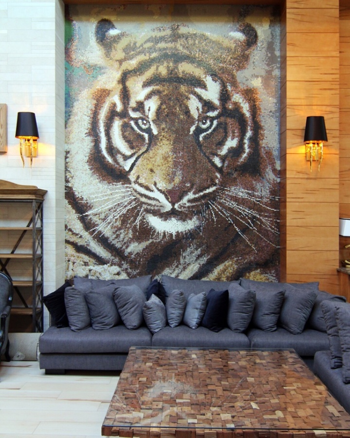 Данный проект был полностью разработан нашей студией. Начиная с архитектурно - дизайнерского проекта, заканчивая реализацией мозаичных изделий в интерьере. Комната отдыха. Центральным оформлением данного помещения, стало мозаичное панно "ТИГР", и два верт
